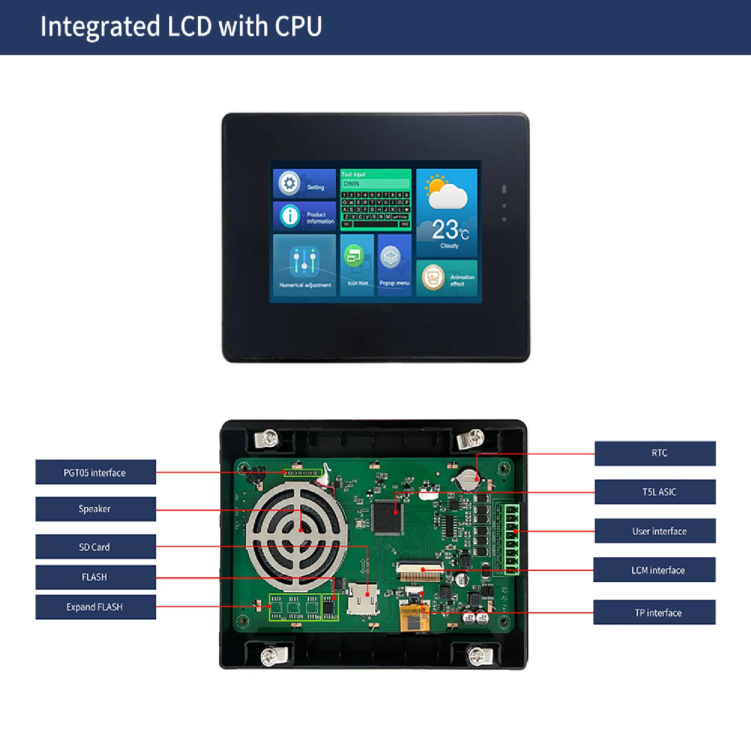 - Based on T5L ASIC 7.0 Inches, 1024xRGBx600, 16.7M Colors, IPS screen
