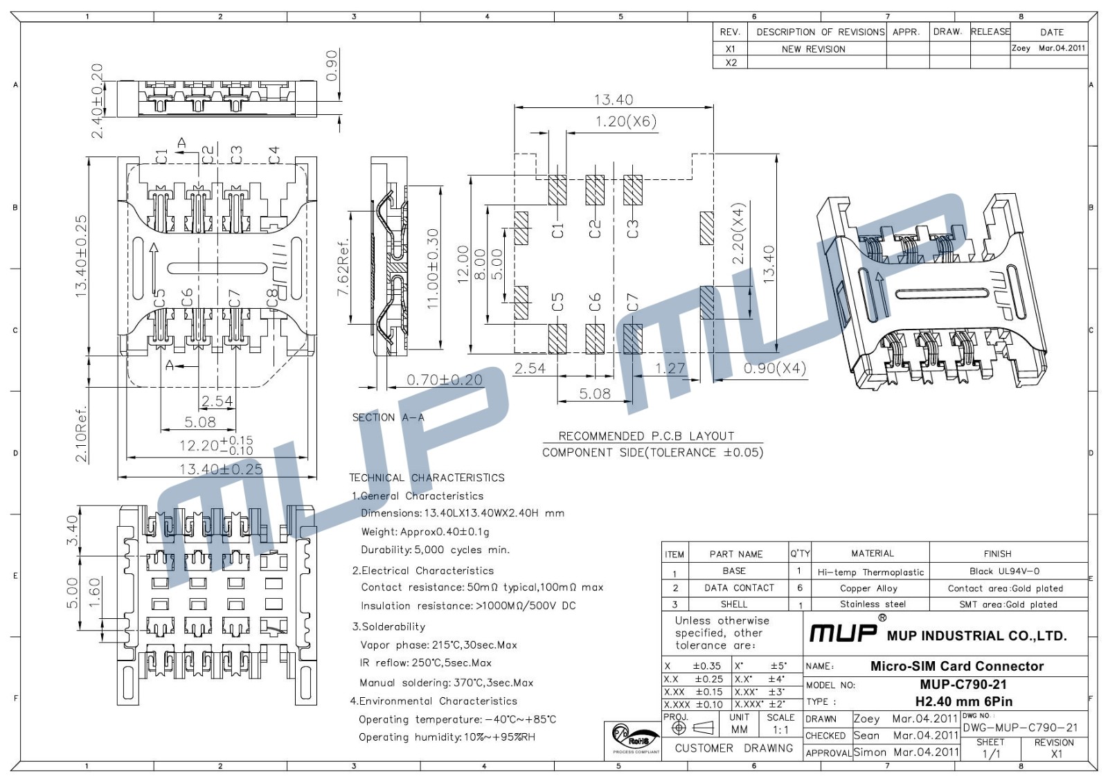 MUP C790-6 pin connector has a number of highly experienced, passion and dedicated professional R&D team, who can Independent complete the design and R&D of new products, also can help customers to solve technical and quality problems related to products to ensure customer satisfaction. Experienced mould manufacturing team. With world-class mould design and processing equipment. The mould has the benefits of more precision and longer life. Have the whole process production capacity of the products. Have advanced production equipment. Continuous improvement of automatic production and assembly capacity. More standardized quality management. Strictly follow international advanced ISO Environmental Management System. Products fully meet EU ROHS Standard. Produce precision connectors with stable quality for customers. This MUP C790 6 pin simcard Connector has a solider ability: Vapour phase: 215oC, 30Sec. Max, IR reflow: 250oC,5Sec.Max and Manual soldering: 370oC,3 Sec Maximum.